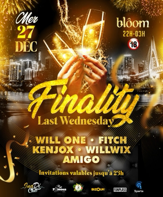 *FINALITY*🎊 _LAST WESNESDAY_ 🗓*MERCREDI 27 DÉCEMBRE* ⌚️ *22h00-03h00* 📍*BLOOM* _C’est l’heure de clôturer l’année avec une touche de Classe._ 💃🏽🕺🏽 _Spécialement pour cette fin d’année nous vous avons concocté un événement de qualité_🔥 *LINE UP DE FOLIE 🔥*: 🔊*AMIGO- WILL ONE - FITCH- KENJOX -WILLWIX*🔊 🎁Récupère ton INVITATION rapidement sur toutes les plateformes🎁 *BILLETERIE EN LIGNE* : ☢️BIZOUK:https://my.bizouk.com/finality ☢️FUNPLASS ☢️SPARTA: 📱*Infos & réservations de sa...
