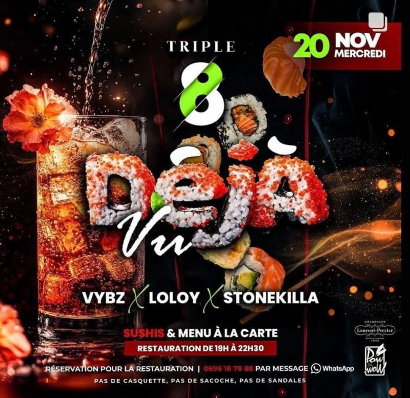 Feux vert pour la mise en bouche…. des papilles à la mise en couple… viens ce mercredi savourer ta Déjà Vu ;) Viens t'exprimer avec tes amis... Sur le Spot qui se décline en Salons ou en Tapis dignes des Mille et une Nuits... pour l'occasion... La Team Ratchèt: Dj VYBZ, Dj STONEKILLA, et Dj LOLOY vont chauffer vos tables et salons. Les Tapas prémiums du Chef Youri ainsi que les Savoureux Sushis du Maître Sushi Valoom Spécialités du mercredi... Des Bulles m'acclament et me réclament ?!!... Déjà,...