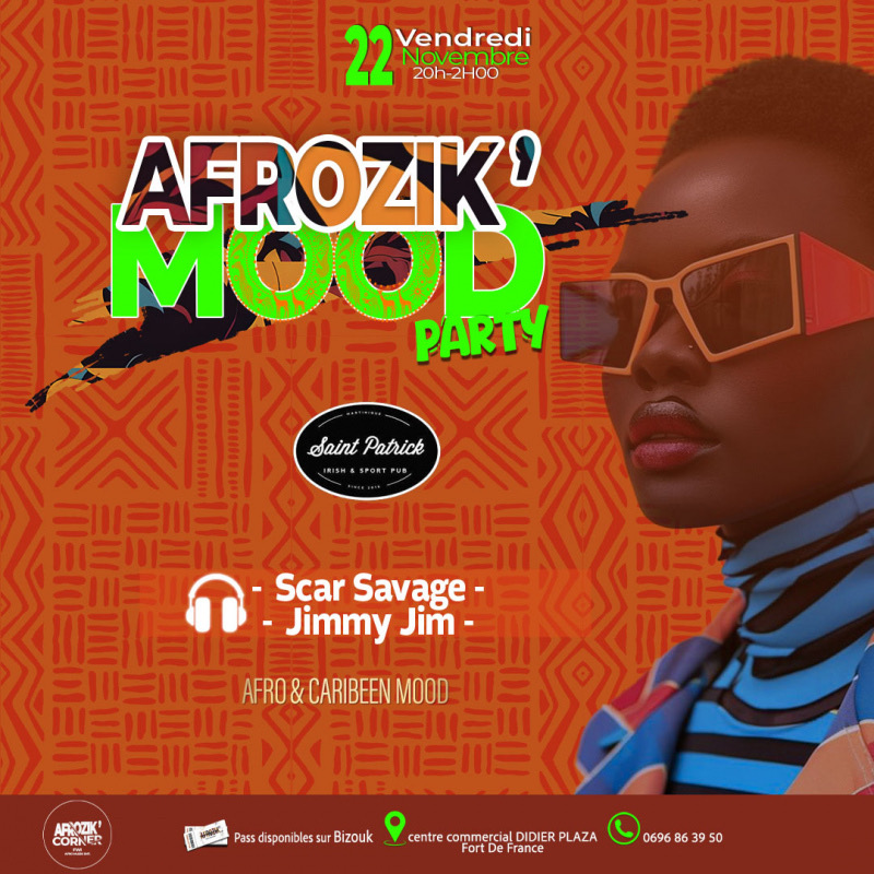 Préparez vous a ressentir un Mood inoubliable !!!! VENDREDI 22 NOV de 20h à 2h le RDV est au SAINT PATRICK. Laissez vous emporter par les multiples sonorités Afro &caribeenes: Afrobeat, Afrohouse, Amapiano , Moombahton ,Reggaetton etc etc. laissez-vous guider par la musique des DJS: *SCAR SAVAGE *JIMMY JIM Enfilez vos tenues les plus vibrantes, thème Afro Caribeen; RESTAURATION POSSIBLE RESERVATION DE SALON . Infoline: 0696 86 39 50
