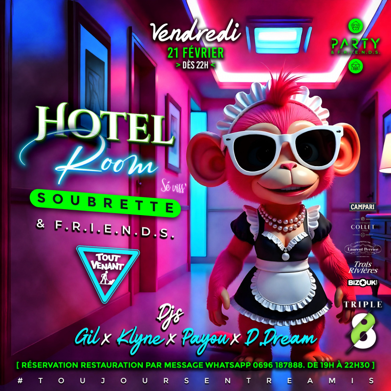 Hôtel Room And F.R.I.E.N.D.S.Les Soubrettes se déchaînent … Le vendredi 21 Février 2025Pénétrez dans un nouvel antre où tout ce qui se passera y resteraLe temps d’une soirée,Oublions les réseaux et enjaillons nous au maximum - Du fantasme de la soubrette qui vous surprend en serviette …- Au 5 à 7 entre adultes consentants … Rejoignez nous et venez vous délecter d’envie et de plaisir sous les coups de boutoirs du carré magique : DJ GiL X DJ Payou X DJ Klyne X D.Dream X DJ Vybz X DJ Coss- Accom...