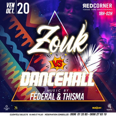 Ce *VENDREDI* de 19h à 2H du Matin ZOUK VS DANCEHAL avec Dj FEDERAL & Dj THISMA Hosted by la TEAM XS On t'attend au REDCORNER pour une soirée EXCEPTIONNELLE. Consommation Obligatoire Réserve Ton Salon VIP dès maintenant 0696.013385