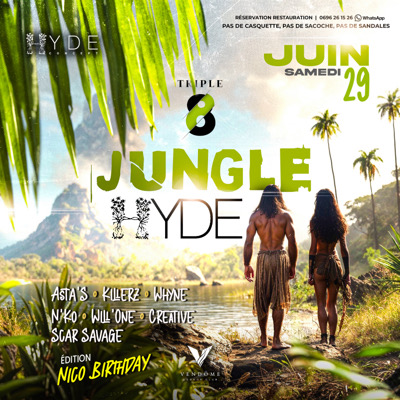 JUNGLE HYDE (Nico Birthday) Samedi 29 Juin au Triple 8 By Hyde concept, FWI Addict et le Vendôme Pour cette 2ème édition de la Hyde au triple 8, on va faire monter d’un cran la température, arrive tôt, pense à réserver pour dîner tôt, il n’y aura pas de la place pour tout le monde et surtout ramène ta joie de vivre et ta bonne humeur. Pour orchestrer cette événement pas comme les autres, nous t’avons recruter les meilleurs: Killerz - Whyne - Asta’s - N’Ko - Scar Sava...