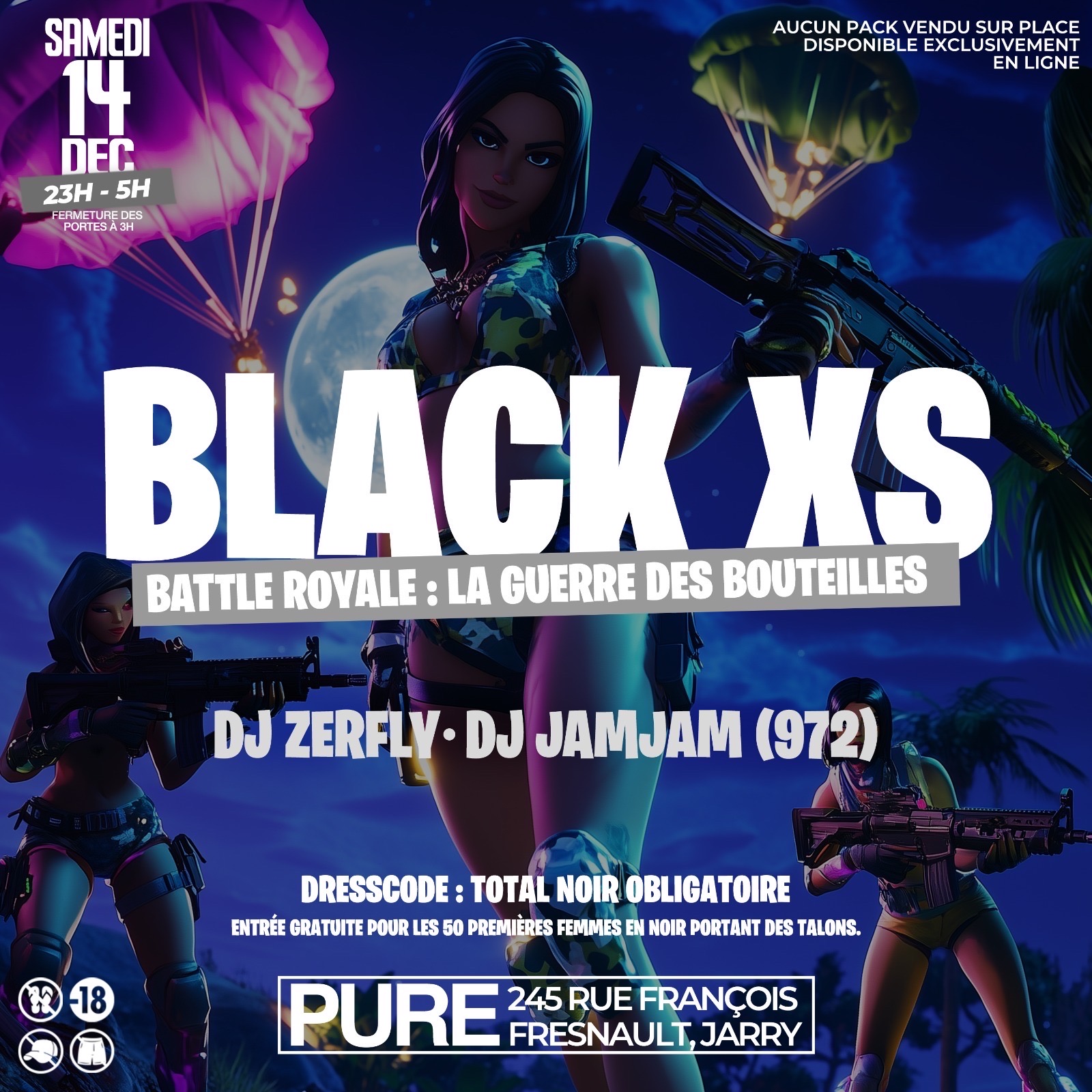 BLACK XS Battle Royale - La guerre des bouteilles LA BLACK XS revient au Pure ce samedi 14 décembre dès 23H00 avec DJ ZERFLY ET DJ JAMJAM de la Martinique. Tu l'as compris c'est full black full alcool full love full tchad. Les packs sont limitées. RDV AU PURE a JARRY.