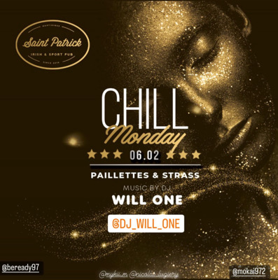 ✨Chill monday ✨ 🫣 before Carnival 🫣 Paillettes et strass Lundi 6 février 🎭 Vient t’ambizncer, au 🍷 saint Patrick 🍷 A partir de 20h avec 🎧 Will’one 🎧 de retour en Martinique