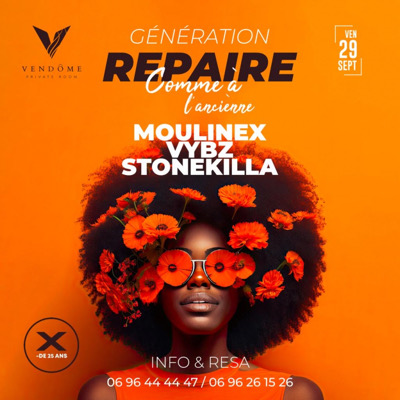 VENDREDI 29 SEPTEMBRE Au Vendôme, la soirée GÉNÉRATION REPAIRE te replonge dans le passé avec du Zouk, Ragga, Dancehall, international et US à l'ancienne. Rendez-vous au VENDOME, EX REPAIRE pour les connaisseurs à partir de 21h Avec vos Djs: VYBZ , STONE KILLA & MOULINEX Vous ferons remonter musicalement le temps. Invitation BIZOUK : Au moins de 25 ans _Horaires: 21h -3h_ Info/résa/table : 0696444447 / 0696261526