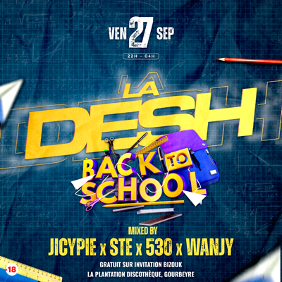 LA DESH ÉDITION BACK TO SCHOOL DE 22H00 A 04H00 ON SE DONNE RDV LE 2€ SEPTEMBRE 2024 A LA PLANTATION DJ JICYPIE • STE • 530 • WANJY INTERDIT MOINS DE - 18 ANS