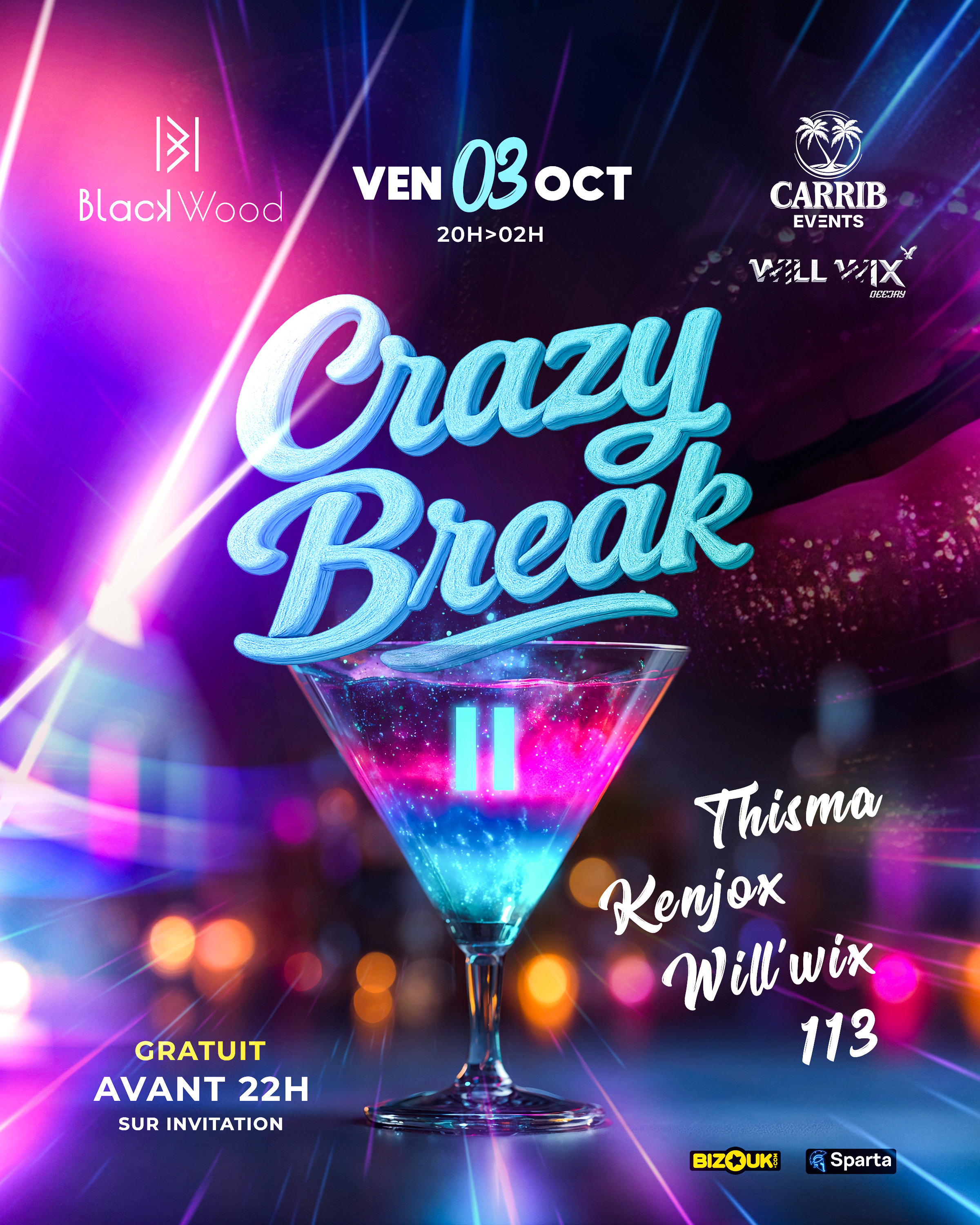 🚨 ALERTE GÉNÉRALE 🍸 Après un mois bien chargé, c’est l’heure de TON premier BREAK de folie avec @carrib_events ! ✨ 🗓️ VENDREDI 03 OCTOBRE 📍 Au BLACKWOOD 🕗 20h00 → 02h00 Viens décompresser comme il se doit avec : 🎧 DJ THISMA – DJ KENJOX – DJ WILL’WIX – DJ 113 👉 Un line-up explosif pour une nuit 100% GoodVibes ! 100% Pression ! 🆓 Entrée GRATUITE avant 22h (Sur invitation Bizouk ou Sparta) ☎️ Infos & réservations salons : 0696 77 96 18 (WhatsApp) 📍 BLACKWOOD 24 zone cocotte canal,...