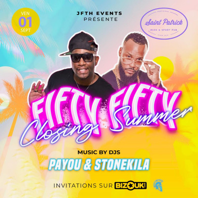FIFTY/FIFTY Édition Pour voyager entre les classiques en Mode Nosta est les Brand News On remet ça une fois de plus ce vendredi 1 er septembre Rdv au St Patrick Bar à partir de 19h avec aux platines : PAYOU & STONEKILA Tenues et esprits corrects exigés A Vendredi Réservation salon : 0696194006 Saint patrick : centre commercial Didier plaza . Fdf .