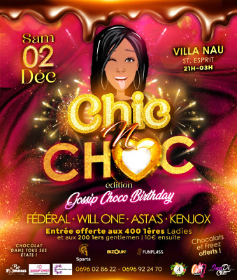 *CHIC N' CHOC* Édition Gossip Choco Birthday 🛍️ 🗓️Samedi 02 Décembre 2023 ⏱️ 21h/03h 🌅Villa Nau au St Esprit 🎉Chocolat dans tous ses états 🍾🥴 Sois Chic mais Choc 😬😝💃🏽🕺🏽 Rouge et Blanc si tu veux mais fais toi et fais nous plaisir.🧑🏽🎄 🎧Djs Fédéral / Dj Will One / Dj Asta's / Kenjox 🎫Entrée offerte aux 400 ères Ladies sur invitations Bizouk, Funplass et Sparta et aux 200ers gentlemen https://my.bizouk.com/chic-n-choc 💶 10€ ensuite 📱Infos au : 0696 02 86 22 / 0696 ...