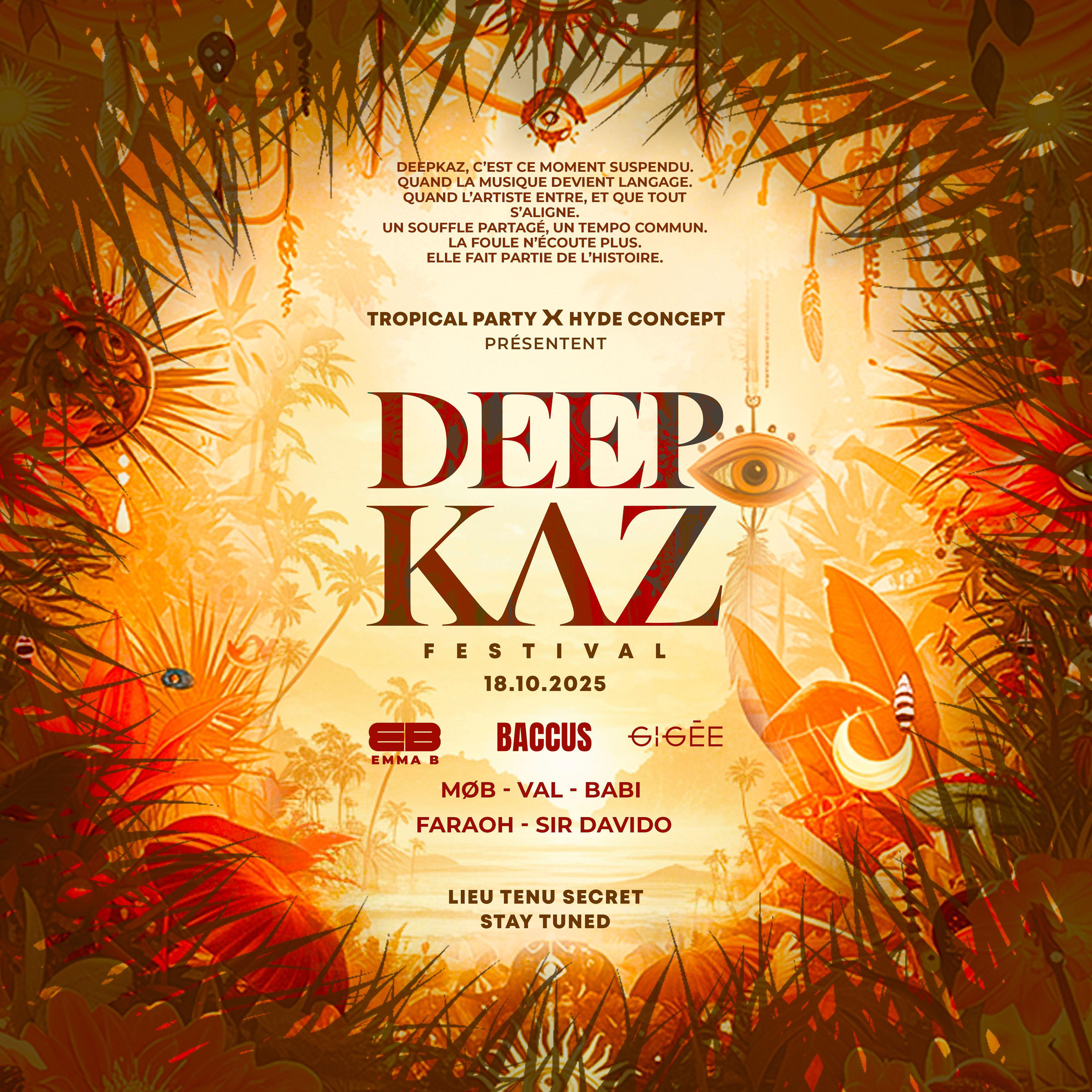 Salut 🌴 Après un an d’événements intimistes, Deepkaz revient pour une édition qui s’annonce incroyable ! Une journée, une nuit, une énergie unique 🌐 Sur scène : Baccus, Emma B, Gigee – nos 3 headliners internationaux, accompagnés des talents locaux Mob, Faraöh, Val, Sir Davido et Babi. 📅 Samedi 18 octobre 2025 – de 14h à 2h 🎟 Tickets dispo dès maintenant sur Bizouk Shotgun. Ne manque pas l’expérience Deepkaz. 💃🏽🧡