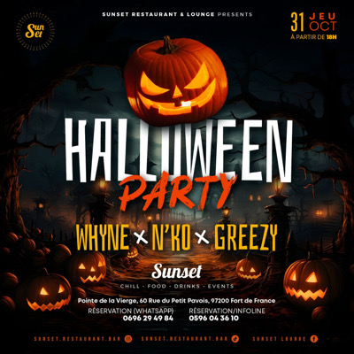 Halloween Party Au manoir du Sunset Sorcières, vampires, fantômes et créatures de la nuit, préparez-vous pour une soirée frissonnante ! Le jeudi 31 octobre des 18h au Sunset . venez célébrer Halloween comme il se doit !