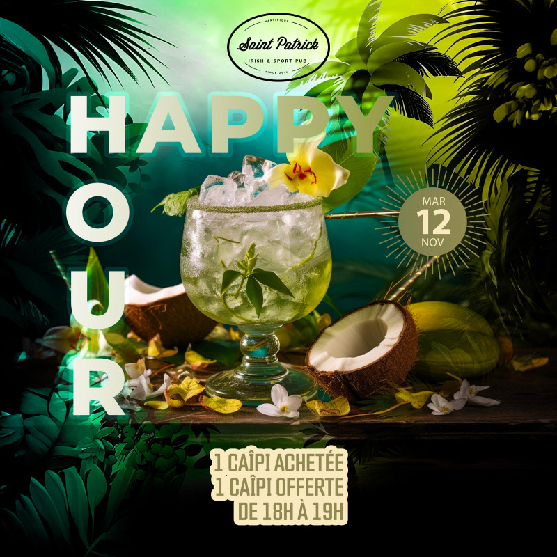 HAPPY HOUR ALERT Viens profiter de notre Happy Hour. 1 caïpi achetée = 1 caïpi offerte de 18h à 19h. Viens avec tes amis pour décompresser et partager un bon moment autour d’une caïpi !