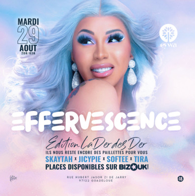 EFFERVESCENCE LA DERNIÈRE DES VACANCES TOUS LES MARDIS - 20H/03H IL NOUS RESTE ENCORE DES PAILLETTES POUR VOUS Line up DJs : SOFTEE - TIRA - SKAYTAH - JICYPIE CHICHA • FOOD • COCKTAIL • MUSIC ENTREES : INVITATIONS LIMITÉES AVANT 23H & CONSO OBLIGATOIRE ENTRÉE SIMPLE 20€ SUR PLACE A EYWA - RUE HUBERT JASOR , Z.I JARRY NO JOGGING - NO SACOCHE - NO SANDALE - NO CHAÎNE