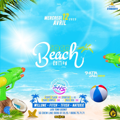 🚨 🌪️ALERTE MAXIMALE🌪️🚨 *Mercredi 15 Avril* 20h-03h Une Vague De Chaleur Va Déferler sur la Martinique 🥵 Séance de Sport intense conseillé par le *SG Crew* Shatta Gang Crew Qui t'a concocté un *After SHS* De Folieeeee 🥳 La *C🥥C 🥥 BEACH* 🌴⛱️Edition Enfile tes Sandales..ton Short de Bain pour les Gars et Pour Mesdemoiselles..on sort la meilleur parure de plage..bikini paréo..presk toutouni..(Si zot lé 🤷🏾♂️) Attachez vos Bouée..et n'oubliez pas vos Fusils à Eau..🔫💦 ...