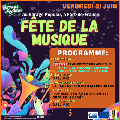 Rejoignez-nous pour une journée inoubliable de musique et de sport au Garage Popular à l'occasion de la Fête de la Musique ! Programme : À partir de 12h : DJ VIGFY animera l'ambiance tout au long de l'après-midi, avec des sets électrisants pour accompagner les matchs de l'Euro 2024 sur grand écran. 12h : Pologne vs Autriche 15h : France vs Pays-Bas À partir de 19h : DJ LJ MIX prendra le relais avec ses mix dynamiques pour vous faire danser jusqu'à la tombée de la nuit. À partir de 20h : La f...
