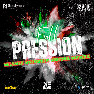 Hello la Team Pression « La Full Pression » au BLACKWOOD Vendredi 2 Août c’est le bordel organisé façon K’RIBBEAN EVENT Tu connais déjà le concept alors emmène ta team et viens te défouler en compagnie des maîtres de la pression: WILLWIX KENJOX SHIMSHIM MADIXX Événement interdit au mineurs. Pièces d’identité physique obligatoire