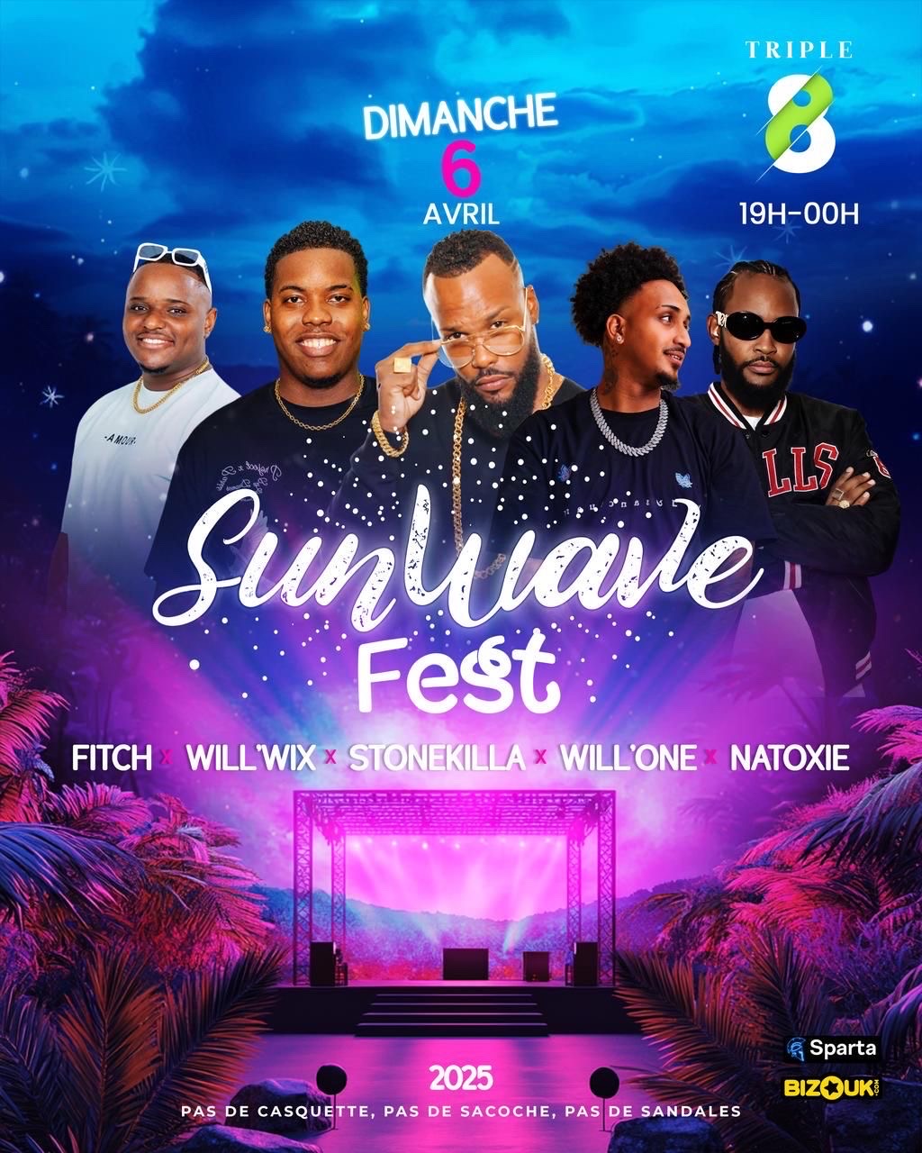 Nous clôturerons en beauté le SUNWAVE FEST par une soirée mémorable dans un lieu que vous connaissez tous ! Et oui ! Votre rendez-vous du dimanche 6 avril est au TRIPLE 8 📍 à partir de 19h 🕗 Aux platines, la crème de la crème 🎶 : * DJ FITCH 🎧 * DJ WILL’WIX 🎧 * DJ STONEKILLA 🎧 * DJ WILL’ONE 🎧 * DJ NATOXIE 🎧 Un line-up explosif pour vous offrir une expérience unique et mémorable 🥳. Et ce n’est pas tout, des surprises vous attendent… alors ne manquez surtout pas ça ! Les billets sont d...