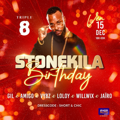 🌟 *STONEKILLA BIRTHDAY* ✨ Dans Le Magnifique Cadre Du *TRIPLE 8* !! 📆 *VENDREDI 15 DÉCEMBRE* ⏰ *20H - 02H* 🌟 *GIL - JAÏRO - AMIGO - WILL WIX - LOLOY - VYBZ* 🌟 🩳 *Soyez Chic En Short* 🩳 🎟️ *INVITATIONS DISPONIBLES SUR BIZOUK VALABLES JUSQU’A 23H* ➡️ https://my.bizouk.com/stonekilla-birthday ➡️