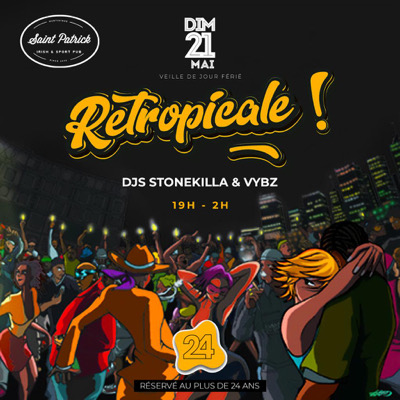 🟠 *RÉTROPICALE* 🟠 *DIMANCHE 21MAI* veille de jour férié à partir de 19h00 et fermeture à 2h 🥳🥳🥳 *Au SAINT PATRICK* ♦️ Tu as plus de 24 ans, tu es nostalgique des bonnes soirées à l'ancienne et veux te retrouver avec des gens de ta génération tout en écoutant du bon son?! *Cette soirée est pour toi !!!* 👇🏽👇🏽👇🏽👇🏽👇🏽👇🏽👇🏽👇🏽 Pour cette 1ère édition on reçoit : 🎧_*DJ STONEKILLA ET DJ VYBZ*_ pour une ambiance tropicale mix music garantie ♦️ coktails ...