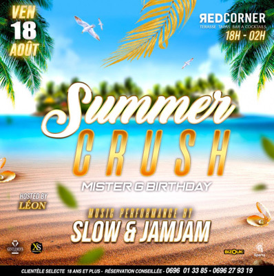 Ce *VENDREDI* de 19h à 2H du Matin, SUMMER CRUSH hosted by LEON avec la TEAM XS au REDCORNER pour une nouvelle soirée EXCEPTIONNELLE avec Dj SLOW & Dj JAMJAM Clientèle selecte Amenés ton collier à fleurs Arrivez tôt !!! Consommation Obligatoire Réserve Ton Salon VIP dès maintenant 0696.013385