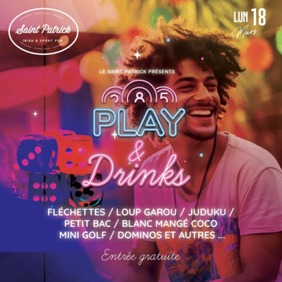 PLAY AND DRINK’S le Bar Saint Patrick vous donne rendez vous pour un after work 100% jeux ce lundi 18 mars de 19h à minuit . Une ambiance conviviale , des jeux de société a disposition , Dominos Fléchettes UNO , Mini golf et bien d’autres .. St Patrick’s Bar : Cc Didier Plaza - Route de Didier - FdF