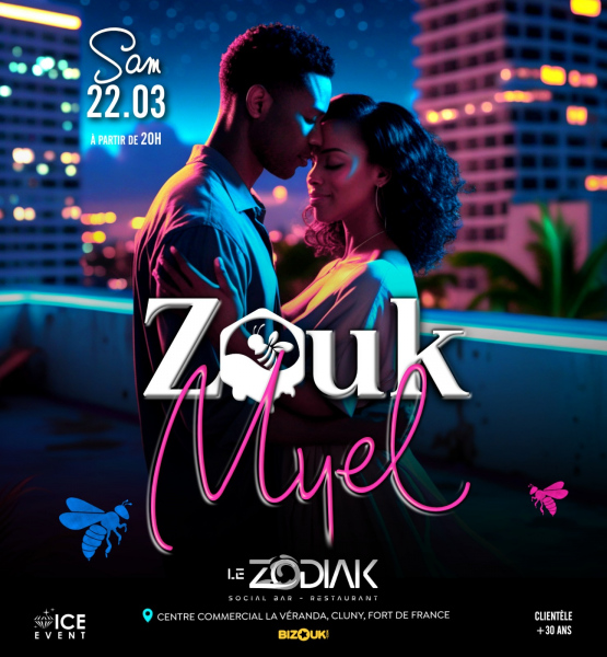 ZOUK MYEL Mes Abeilles Ce Samedi 22 Mars,Ambiance 100% douceur, kolé-seré, MIEL La RUCHE sera située auZODIAKCentre commercial la Véranda à Cluny, FDFTon invitation ici CLIENTÈLE +30ansInfo/Résa 0696 051 531 (Seulement sur WhatsApp)