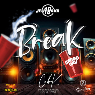 Ce JEUDI 18 AVRIL et si on faisait une pause entre pote juste pour décompresser mais oui tu connais... rdv dès 19h00 !! pour la BREAK •••••••••••••••••••••••••• #OuvertureDesPortes 19h00 Possibilité de se restaurer sur place Music By DJ AMIGO DJ DAV Cab'K TENUES ET ESPRITS CORRECTS EXIGÉS; LA DIRECTION SE RÉSERVE LE DROIT D'ENTREE. Il est conseillé d'arriver tôt car une invitation ne garantit pas le droit d'accès et privilégier le covoiturage
