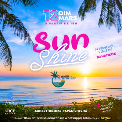 Dimanche 12 Mars, *🌤️SUNSHINE🌤️* #AFTERBEACH 🌊 🌸 *SUNSET ¤ CHILL ¤ GOOD VIBES* 🌸 Ramène ta tenue de plage et on s'occupe du reste avec *DJ NATOXIE ⚡🤩* 📍Wanted Paradise (Nouvelle Marina du Marin) 📲 Info/Résa : 0696 051 531 (WhatsApp uniquement)