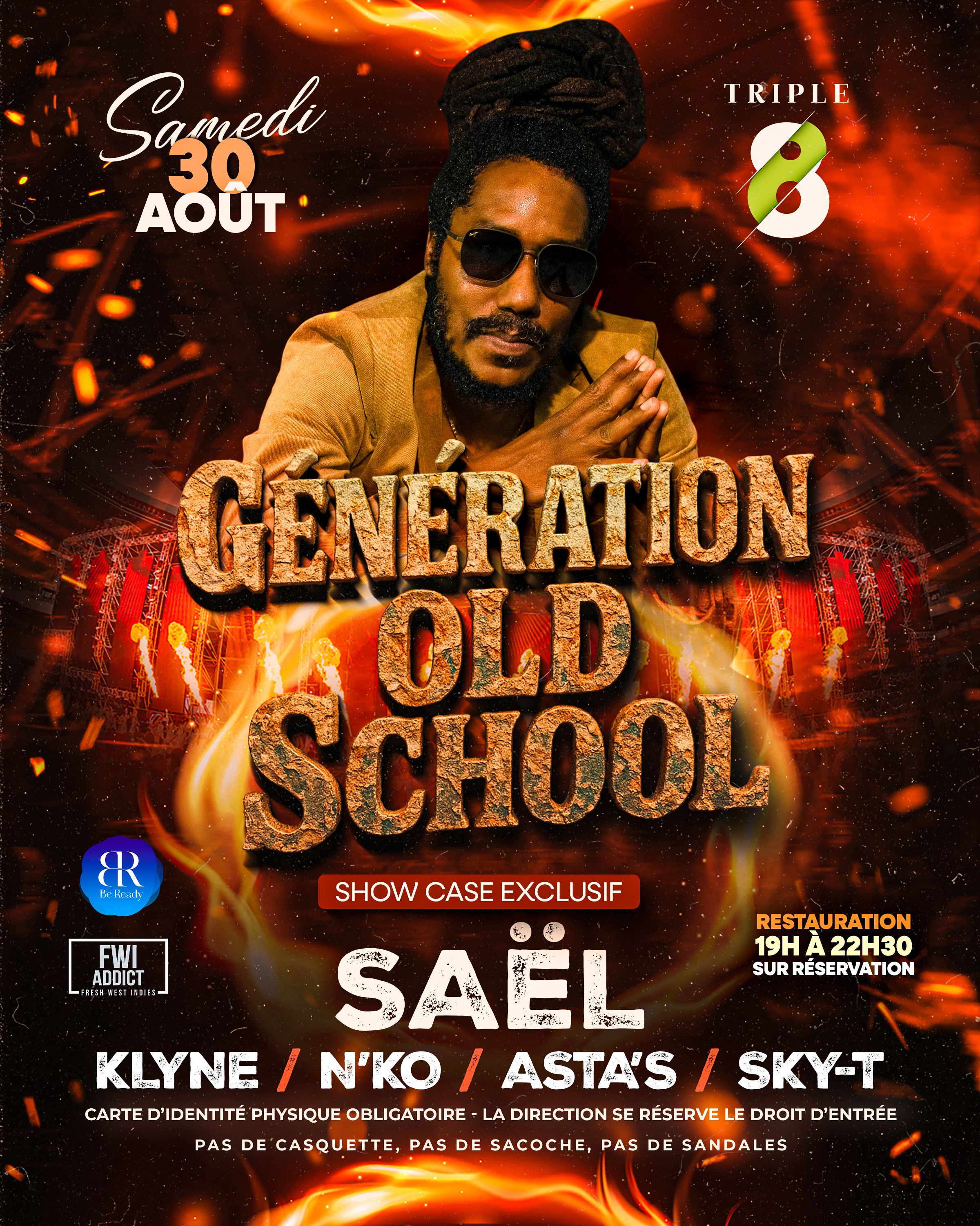 🔥 FWI ADDICT x BE READY présentent 🔥 📍 TRIPLE 8 📅 Samedi 30 août 2025 🎤 Showcase exceptionnel de SAEL – pour une soirée unique qui viendra clôturer les vacances 2025 en beauté ! 🍽️ Dîner dès 19h ( Wa: 0696187888) 💃 Soirée dès 22h 🎧 Aux platines : DJ Klyne – DJ N’Ko – DJ Asta’S – DJ Sky-T 🎟️ Tickets disponibles dès maintenant sur Sparta ⚡ Réservez vite vos places, l’événement s’annonce inoubliable !