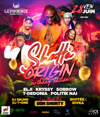 SHATTA ORIGIN’ • BIRTHDAY ÉDITION• Ce Vendredi 28 Juin de 21h00 à 03h00 Au PHOÉNIX (Rivière-Pilote) Retour aux sources pour un show mémorable avec ELJI KRYSSY T-DEDONIA SORROW POLITIK NAÏ RIVKA Live band by DON SHORTY DJs SKUNK ET T-ONE