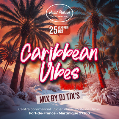 Caribbean Vibes Ce vendredi 25 Octobre à partir de 20h, les meilleurs sons caribéens mixés par Dj Tix’s Dans une ambiance unique: -Cocktails rafraîchissants - Convivialité garantie Réservation de salon au 0696 86 39 50