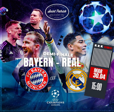 SPORT BAR SAINT PATRICK CHAMPIONS LEAGUE Demi finale aller . * MARDI 30 AVRIL _Ouverture des portes à 14 h 00._ ~ BAYERN - RÉAL MADRID - © Entrée gratuite . • Info ou resa de salon : 0696194006 (WhatsApp ) C.C Didier Plaza FdF