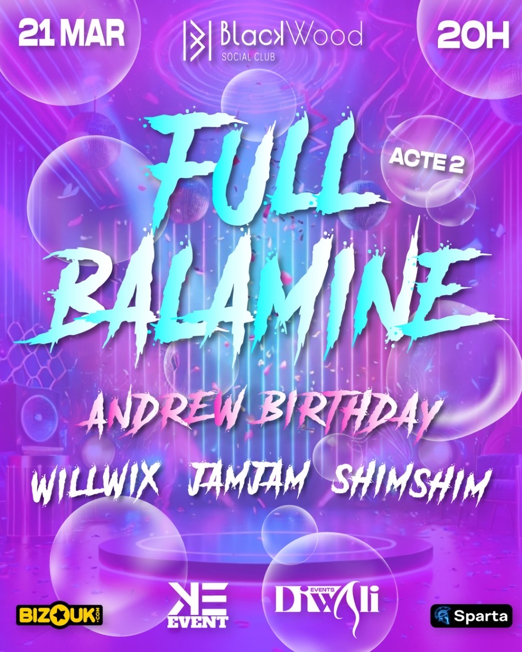*FULL BALAMINE Act.2 - Andrew Birthday Édition* Et si je te dis « One Balamine for yooouuu, Two Balamine for you… » Tu as raté la Full Balamine Act.1 ? Ne t’en fais pas ! Vous l’avez tous demandé et il est enfin là: LE GRAND RETOUR DE *LA FULL BALAMINE* Et quoi de mieux pour fêter l’anniversaire de notre frère à tous, l’Homme Balamine en personne: Andrew K’Events, en collaboration avec Diwali Events te donne rendez-vous le Vendredi 21 Mars pour une soirée de folie en l’honneur de notre c...