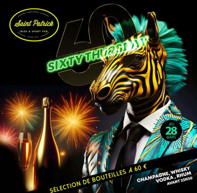 CE *JEUDI 28 Mars* C'EST Les Vacances au _Saint Patrick_!! >>> *LES BOUTEILLES A 60€* !!!<<< >>>ENTREE OFFERTE A TOUS <<< L'INDETRONABLE #SIXTYTHURSDAY EST DE RETOUR POUR VOTRE PLUS GRAND PLAISIR AVEC LES MEILLEURS DUS DE L'ILE!!! Open dès 19 h 00 . TENUES ET ESPRITS CORRECTS EXIGES INFO +596 696 194006 (SMS et WHATSAPP) TOUTES LES BOUTEILLES A 60€ #SIXTYTHURSDAY #JEUDI28MARS #SAVETHEDATE