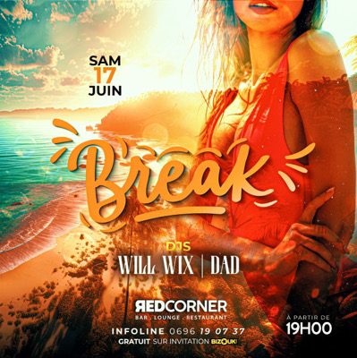 🏖️☀️ *_FULL BREAK_* ☀️🏖️ _SAMEDI 17 JUIN_ _dès 19h Au REDCORNER_ ✨ 🎶 *WILL WIX & DAD* 🎶 Récupère ton pass : Bizouk ➡️ https://my.bizouk.com/full-break-will-3 SPARTA ➡️ _*La direction se réserve le droit d’entrée*_