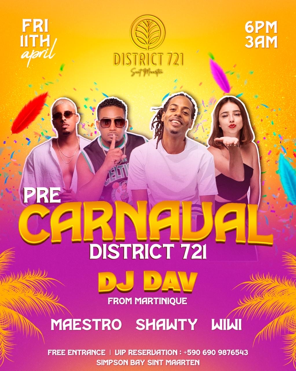 FRIDAY – PRE-CARNAVAL NIGHT 🎭🔥🥁 This is the BIG one! DISTRICT 721 goes full carnival mode — feathers, colors, madness! With our special guest DJ DAV from Martinique bringing that Caribbean HEAT! ✨ Get your crew, your outfits, your energy… this is the night to remember!