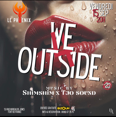 RDV ce vendredi 15 Septembre à partir de 20h, la We OutsSide vol.4 T'attend au * ° Phoenix * pour une nouvelle soirée EXCEPTIONNELLE We OutSide 3 avec Di Shimshim Tjo sound Tenue correcte exigée : Pas de casquette, pas de jogging, pas de sandales ! Esprit correct recommander Entrée gratuite Arrivez tôt !!! Réserve Ton Salon VIP dès maintenant au 06 96 07 35 15