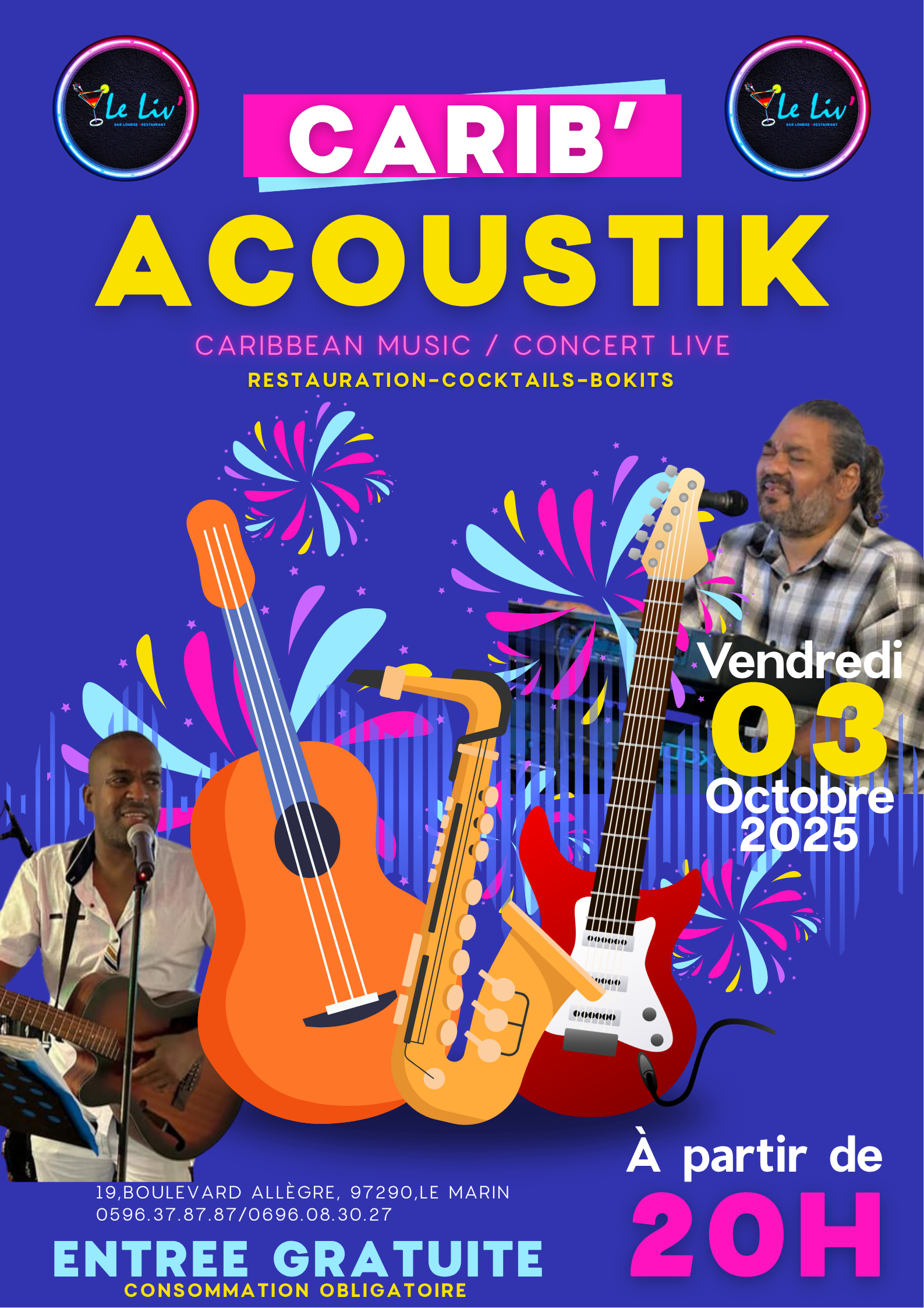 ✨Tu viens, tu manges,tu bois, 🗣️tu chantes avec nous, tu danses avec nous et on s’enjaille...💫 🎸CARIB’ ACOUSTIK🥁 concert live - diner concert - caribbean concert 🗓️ *VENDREDI 03 OCTOBRE* ⏰ *19H-02H* 🎶🎵 *Cedric Eugène x David corompli* 🍽️Restauration-🥗Plats-🍸Cocktails-🌮Bokits-🎶Musique live *Entrée gratuite Consommation OBLIGATOIRE!* 0596.37.87.87/0696.08.30.27 19,BOULEVARD ALLÈGRE, 97290, LE MARIN