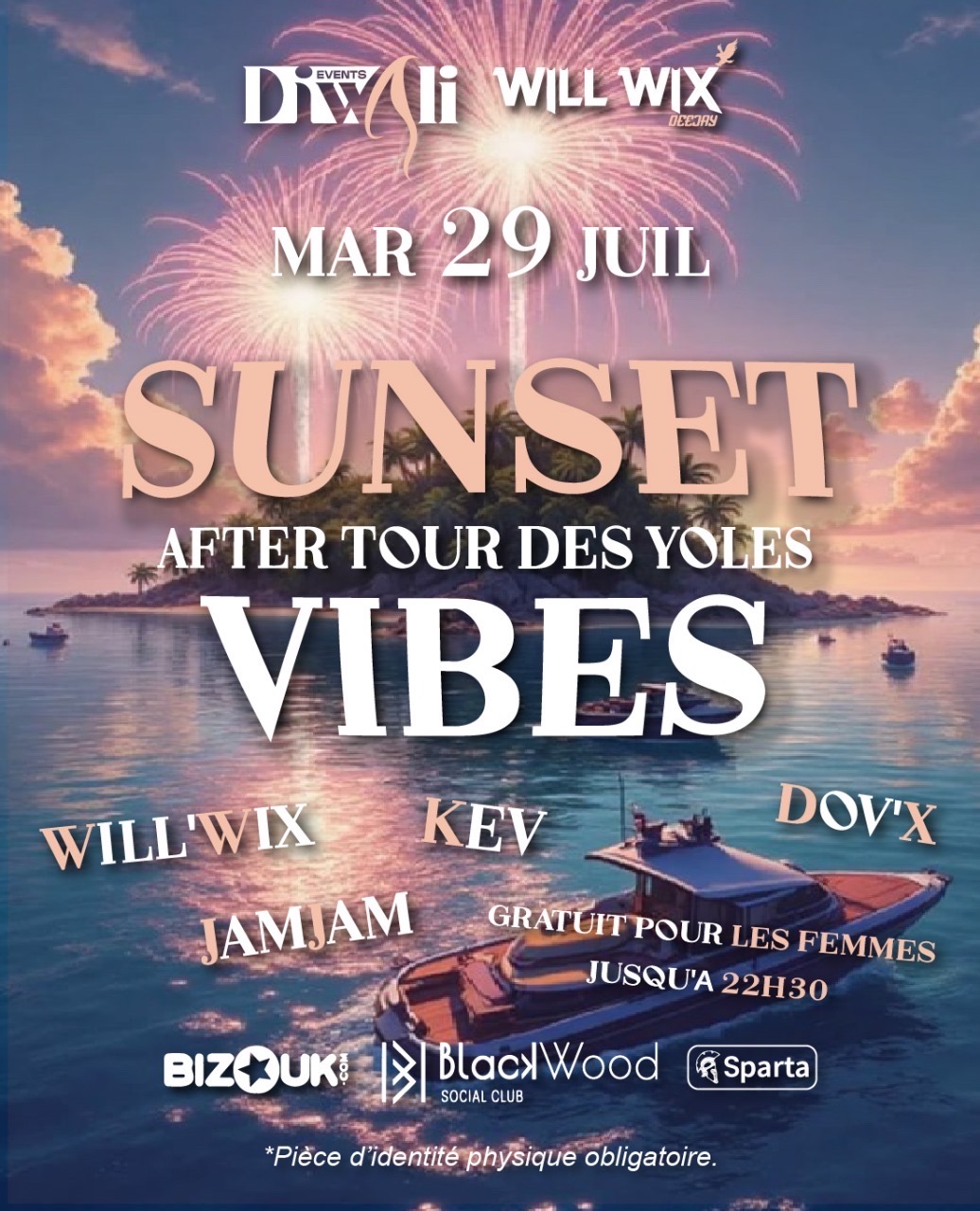🔥 SUNSET VIBES – AFTER TOUR DES YOLES 🔥 📅 Mardi 29 Juillet 🌅 Une ambiance sunset inoubliable pour clôturer le Tour des Yoles comme il se doit ! 🎶 Prépare-toi pour une line-up de FOU sur 4 jours avec : 🎧 WILL’WIX 🎧 JAMJAM 🎧 KEV 🎧 DOV’X 💃 LADIES : l’entrée est 100% GRATUITE jusqu’à 22H30 ‼️ 🌴 Ambiance plage, sunset & good vibes garanties 🌊 🔐 Pièce d’identité physique obligatoire 📲 Réserve ta place sur Bizouk