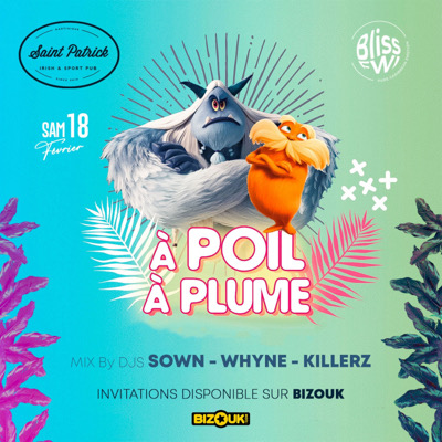 CE SAMEDI 18 FÉVRIER BLISS FWI & LE SAINT PATRICK À POIL À PLUME Boas, fourrures, plumes, animaux ou oiseaux en tout genre .. ce ne sont que de petits indices ! Faites nous rêver *SHOOTER OFFERT pour les personnes déguisés avant 22h00* AUX PLATINE SOWN - WHYNE - KILLERZ* Infos ou resa de salon très conseillée : 0696 35 06 94