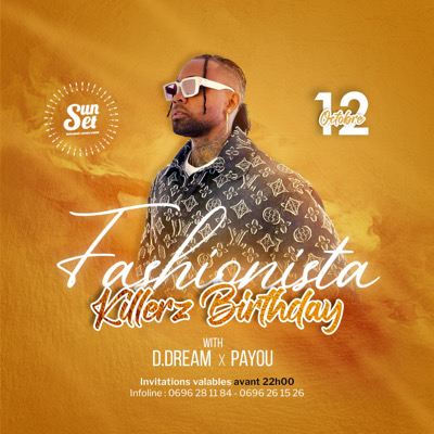 Ce *jeudi 12 oct* des 19h Au *Sunset* Rdv pour la ••*FASHIONISTA*•• Édition : *Birthday KILLERZ* *With PAYOU & DDREAM* Faisons de cet événement un défilé, le décor est planté vous serez les acteurs de cette mise en scène !!! ```Sortez vos tenues, hypes originales déjantés décalés,bref soyez différents !``` Resa salons et invitation au 0696281184 ou 0696261526 Venez sur place Dîner ou déguster des tapas accompagnés de cocktails des 19h30 ! #Hype #Branché #Talons #Dr...