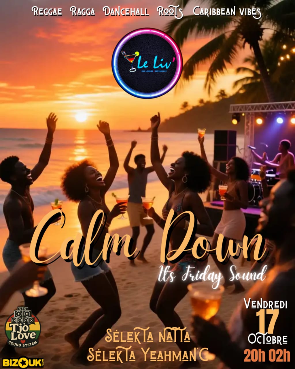 🌴 Calm Down – It’s Friday Sound ! 🌅 Ce vendredi 17 octobre, viens vibrer sur la plage du Le Liv’ pour une soirée 100 % Reggae – Ragga – Dancehall– Roots – Caribbean vibes 🔥 Ambiance tropicale garantie avec les sélektas NaTTa & YeahmanG aux platines, le tout sur le Tijo Love Sound System 🎶 🍹 Cocktails, sable chaud, good vibes et danse jusqu’à 2h du matin ! Viens relâcher la pression, bouger, sourire et profiter du coucher de soleil dans une atmosphère purement caribéenne 🌺 Respire😮💨et ...