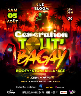 🪩*GÉNÉRATION TOUT' BAGAY*💿 ⚡️ *Le choc des Générations* ⚡️ 🕺🏾💃🏾 Ambiance Mi Nosta - Mi News Zouk, Ragga, Soca, Dancehall 💃🏾🕺🏾 🗓️ *Samedi 05 Août 2023* 📍 *Le BLOOM (Cour Perrinon FDF)* ⌚️ *21h - 03h* 🎶 Ambiance assurée par : 🎶 🎧 *BOOFY* 🎧 *STONEKILLA* 🎧 *ACE* 🎟️ *EVENEMENT GRATUIT SUR INVITATIONS (limitées) valables pour tous avant 23h30 Ensuite 20€* https://my.bizouk.com/generation-tout-bagay Préventes : 15€ sur Bizouk.com 🚨 Strictement interdit aux moins de 20 ans ❌...