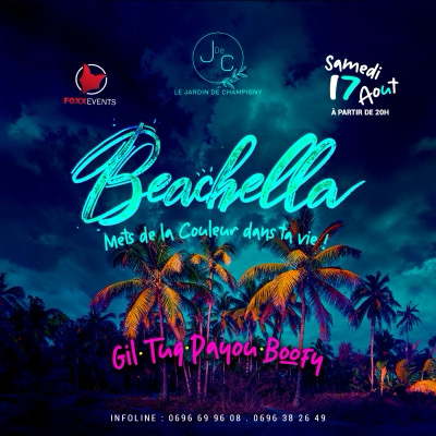 🔥la BEACHELLA revient ce 17 Août!!! 🔥🔥Parez-vous de couleurs🌈sur un ton d'Exotisme pour la soirée exubérante de ces Vacances🤩 Soyez Fashion, Modèle, Star d'un soir sur le Red Carpet📸 Laissez-vous emporter par la Musique sous toutes les coutures 💿💿💿 Gil, Tug, Payou, Boofy en Direction Artistique🔥🔥 Trinquez à la vie 🥂🍹dans une ambiance explosive💣 et colorée🎊And Now!!!👉🏾... Are You Ready???🎊🎊🎊 📌 Lieu : Jardin de Champigny (20h-03h) ☎️Infoline : 0696382649 - 0696699608