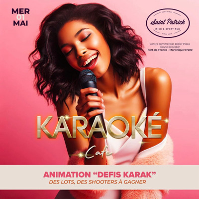 Mercredi 1 er MAI + BRILLEZ SOUS LES PROJECTEURS AU SAINT-PATRICK CHAQUE MERCREDI! * Rejoignez-nous pour une soirée de pur divertissement et de performances vocales mémorables! Rassemblez vos amis et préparez-vous à éblouir la scène avec vos chansons préférées! Le karaoké démarre à 19h00, alors venez tôt pour réserver votre moment de gloire! FREE Entrée libre Rejoignez-nous au Saint-Patrick, au centre commercial Didier Plaza à Fort-de-France. Pour plus d'infos, appelez le 0696194006.