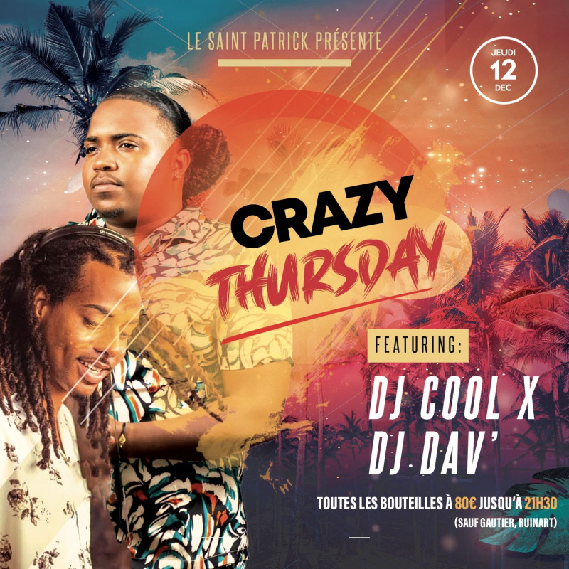 Jeudi 12 Décembre, CRAZY THURSDAY Bienvenue dans un monde où les sonorités vous pousseront dans une folie extrême. DJ Dav’ x Cool X Toutes les bouteilles à 80€ jusqu’à 21h30. (*Sauf Gautier et Ruinart) Prenez vos pass et soyez prêt car ce sera incroyablement chaud