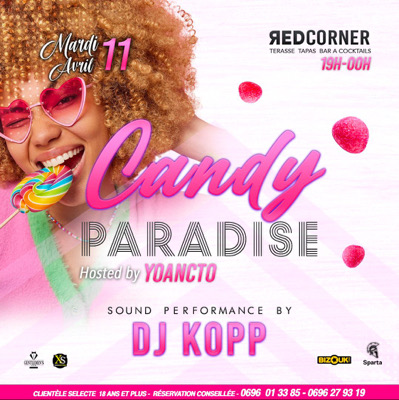 *📆 MARDI 11 AVRIL* Dj *KOPP* et la *TEAM XS* te donnent rendez-vous au *📍REDCORNER* De 19h À 00h pour une soirée *d'ANTOLOGIE* *🍭🍧 CANDY PARADISE 🍫🍬* _Hosted by YOANCTO_ *🎧 Dj KOPP* aux platines pour vous Ambiancer 💦👅 _🍬🍭 *SHOOTERS BONBONS OFFERTS* à ceux et celles qui arriveront tôt 🥰_ *Entrée GRATUITE* Arrivez tôt ! _🍱 Restauration disponible sur place jusqu'à 23h30. 🍱_ _*Réservation de Salons*_ 0696.013385 _*(Whatsapp)*_ 0696.279319 _⚠️ La Direction se réserve EXCLUSI...