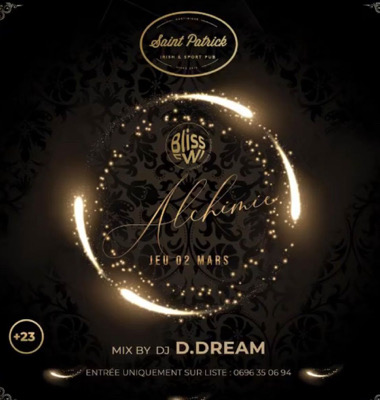 Alchimie ou encore l'art de transformer un Jeudi en Week-end. Ton after-work branché de la capitale avec Bliss_fwi au Saint-Patrick. Viens décompresser entre amis ou collègues. Réservation / liste: 0696 35 06 94
