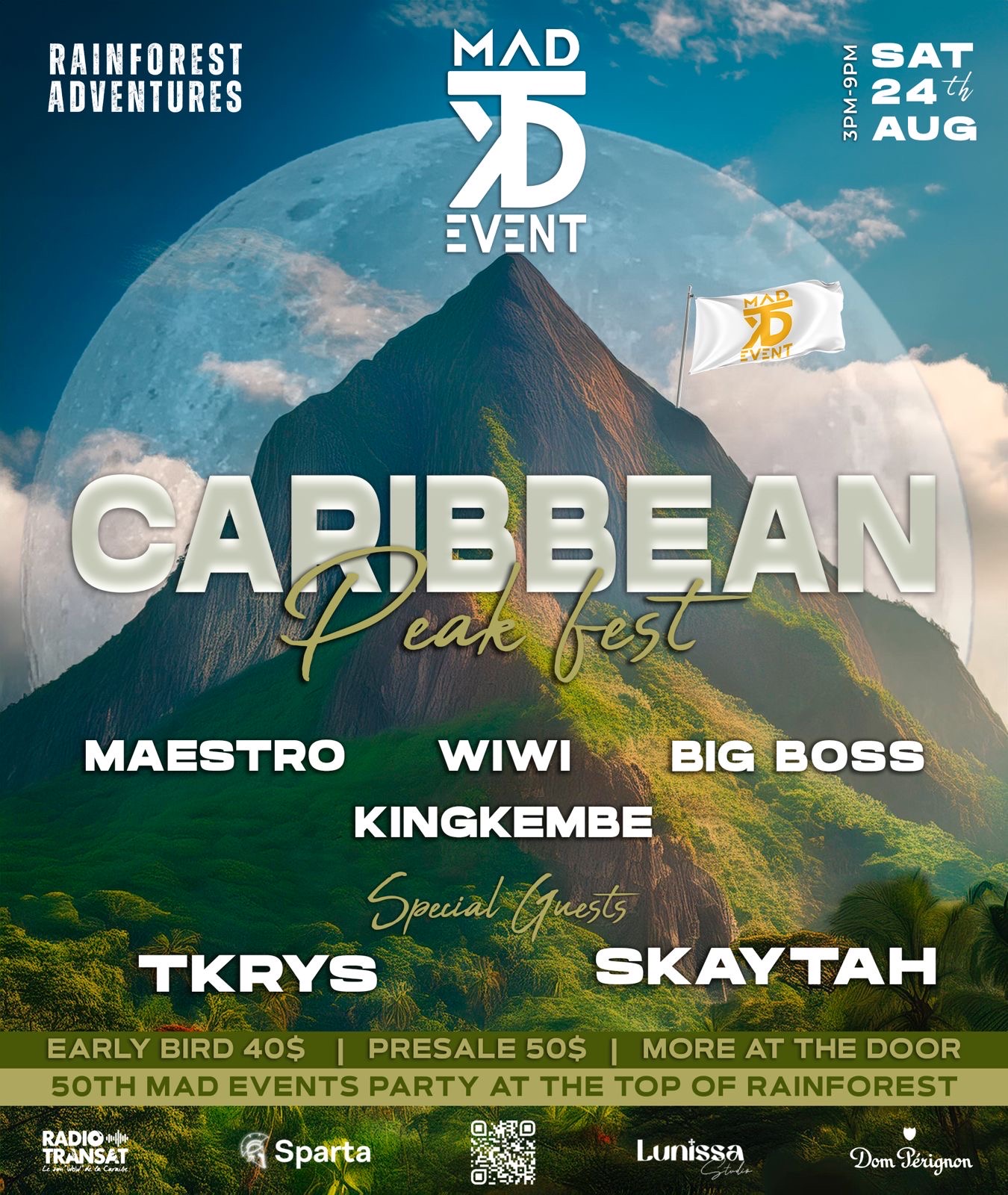 ✨CARIBBEAN PEAK FEST✨ at Rainforest Adventures 📍 On Saturday, August 24th, MAD EVENTS celebrates its 50th event with the inaugural edition of CARIBBEAN PEAK FEST at Rainforest Adventures, high above SXM. 🕒 STARTS at 3 PM For this special occasion in a truly unique venue, we’ve gathered the best DJs from the island, along with two of the Caribbean's top DJs, TKRYS and SKAYTAH, as special guests for this Shatta Bouyon edition 🔥 💥 MAD EVENTS x RAINFOREST ADVENTURES 💥 🎧 DJ Lineup: - KING...
