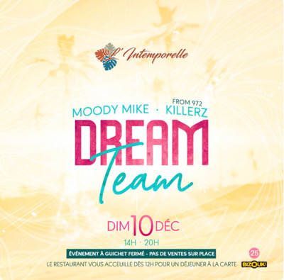 « LA DREAM TEAM » DIMANCHE 10 DÉCEMBRE À L’INTEMPORELLE MIX BY DJ MOODY MIKE & DJ KILLERZ FROM 972. ÉVÉNEMENTS STRICTEMENT interdit aux moins de 25 ANS !!! Pièce d'identité obligatoire !! Dresscode: URBAN INTERDITS: bijoux ostentatoires,tenue de plage ,sandales !!! La direction se réserve le droit d’entrée !!!